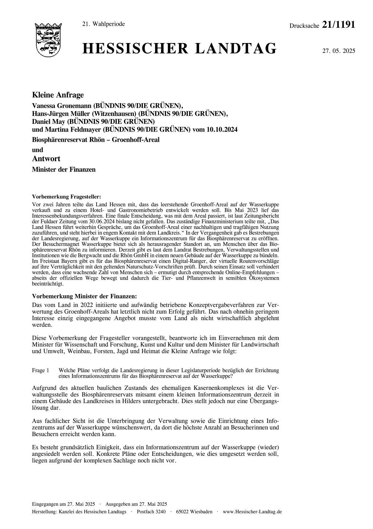 Kleine Anfrage: Biosphärenreservat Rhön - Groenhoff-Areal < Zurück Kleine Anfrage Biosphrenreservat Rhn Groenhoff Areal Kleine Anfrage - Biosphärenreservat Rhön – Groenhoff-Areal.pdf 72 KB download-circle