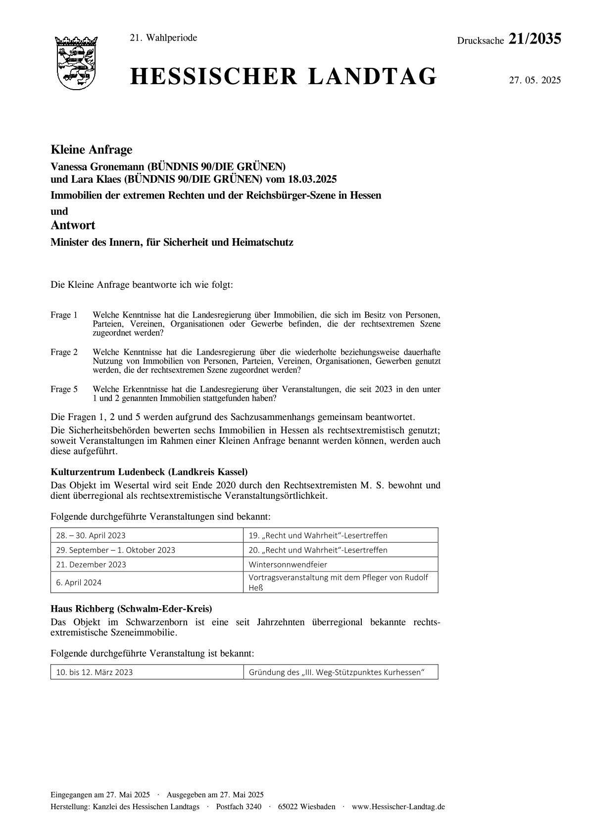 Kleine Anfrage: Immobilien der extremen Rechten und der Reichsbürger-Szene in Hessen < Zurück Kleine Anfrage Immobilien der extremen Rechten und der Reichsbrger Szene in Hessen Kleine Anfrage - Immobilien der extremen Rechten und der Reichsbürger-Szene in Hessen.pdf 107 KB download-circle
