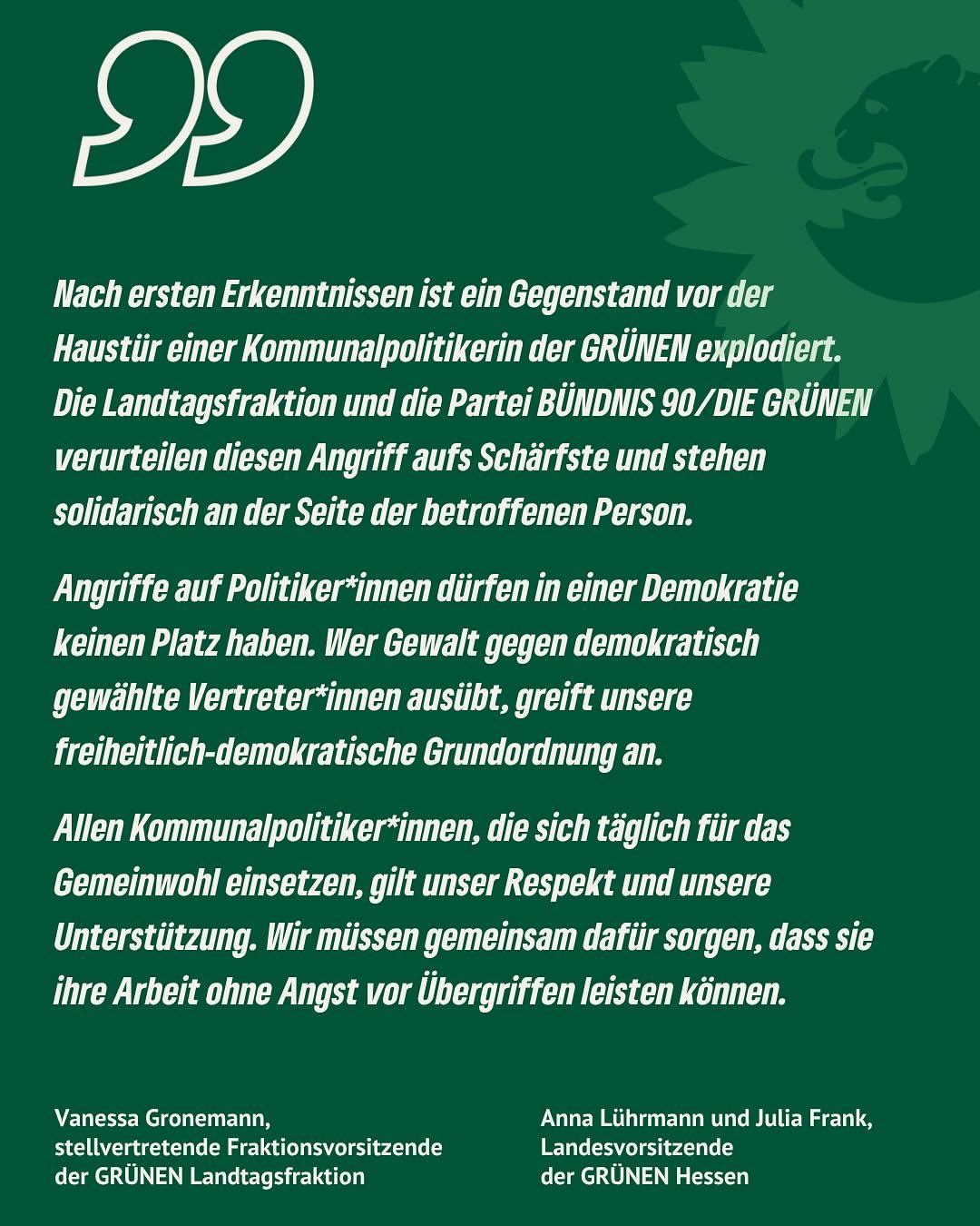 Nach ersten Erkenntnissen ist ein Gegenstand vor der Haustür einer Kommunalpolitikerin der GRÜNEN explodiert. Die Landtagsfraktion und die Partei BÜNDNIS 90/DIE GRÜNEN verurteilen diesen Angriff aufs Schärfste und stehen solidarisch an der Seite der betroffenen Person. Angriffe auf Politiker*innen dürfen in einer Demokratie keinen Platz haben. Wer Gewalt gegen demokratisch gewählte Vertreter*innen ausübt, greift unsere freiheitlich-demokratische Grundordnung an.